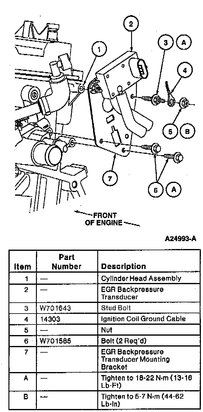 19. Remove EGR backpressure transducer mounting bracket retainers and EGR backpressure transducer and mounting bracket as an assembly from the RH cylinder head.