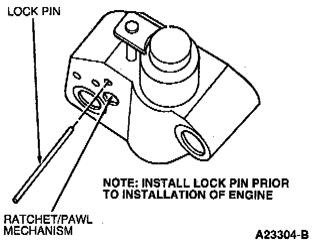 71. Drain oil from tensioner housing and plunger cavity. Reassemble spring and plunger into housing. Compress tensioner into housing to bottom of bore. With plunger held at bottom of bore, rotate ratchet 180°, push back pawl with screwdriver and push ratchet down to contact plunger. Insert lock pin into hole in tensioner housing.