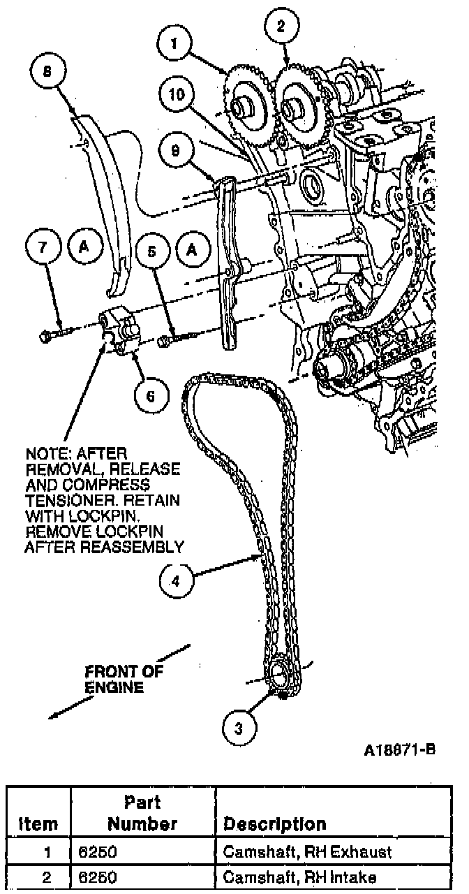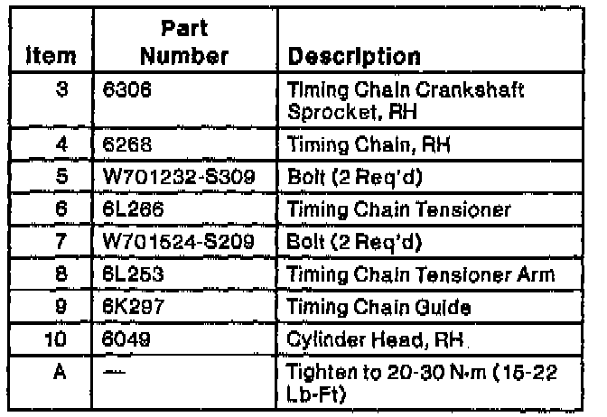 CAUTION: If RH timing chain tensioner arm (6L253) and RH timing chain guide (6K297) are to be reused, mark position of timing chain tensioner arm and timing chain guide to make sure that they are assembled in their original positions.