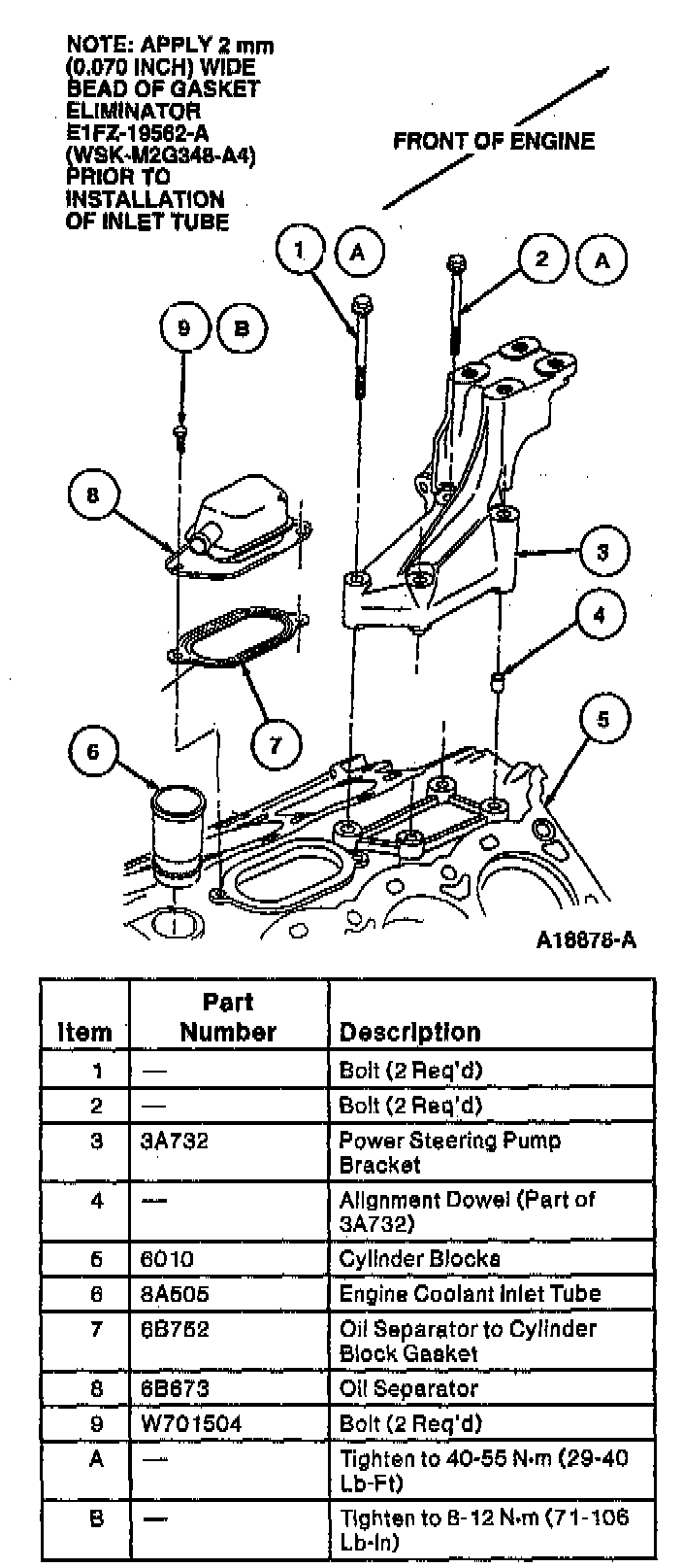 93. Remove oil separator retaining bolts, oil separator and oil separator to cylinder block gasket (6B752) from cylinder block. Discard oil separator to cylinder block gasket.