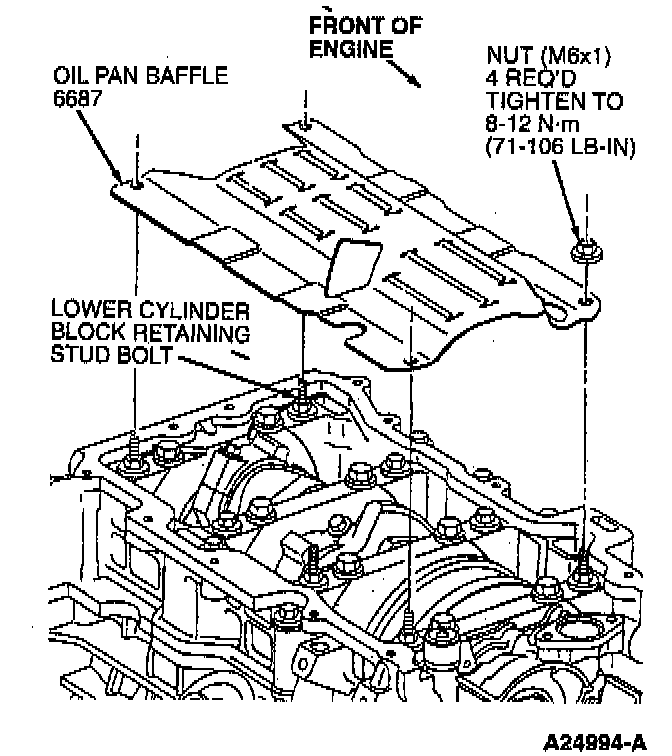 99. Remove oil pan baffle retaining nuts and oil pan baffle (6687) from lower cylinder block retaining studs.