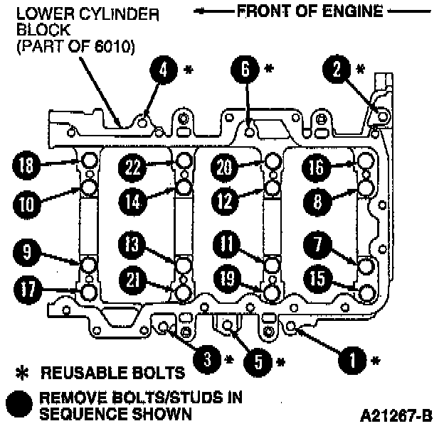109. Using removal sequence, remove lower cylinder block retaining bolts.