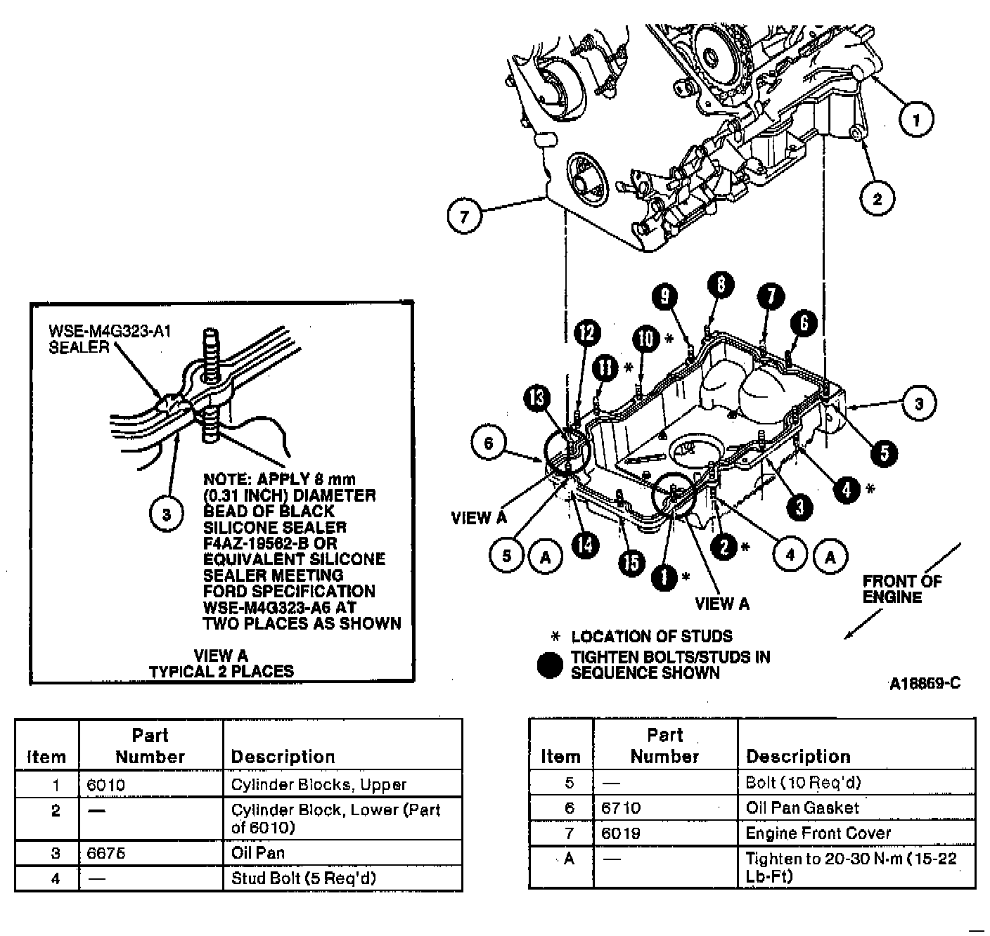 14. Install a new oil pan gasket (6710) and apply an 8 mm (0.31 inch) diameter bead of Black Silicone Rubber F4AZ-19562-B or equivalent sealant meeting Ford specification WSE-M4G323-A6 on oil pan gasket as shown in the illustration.