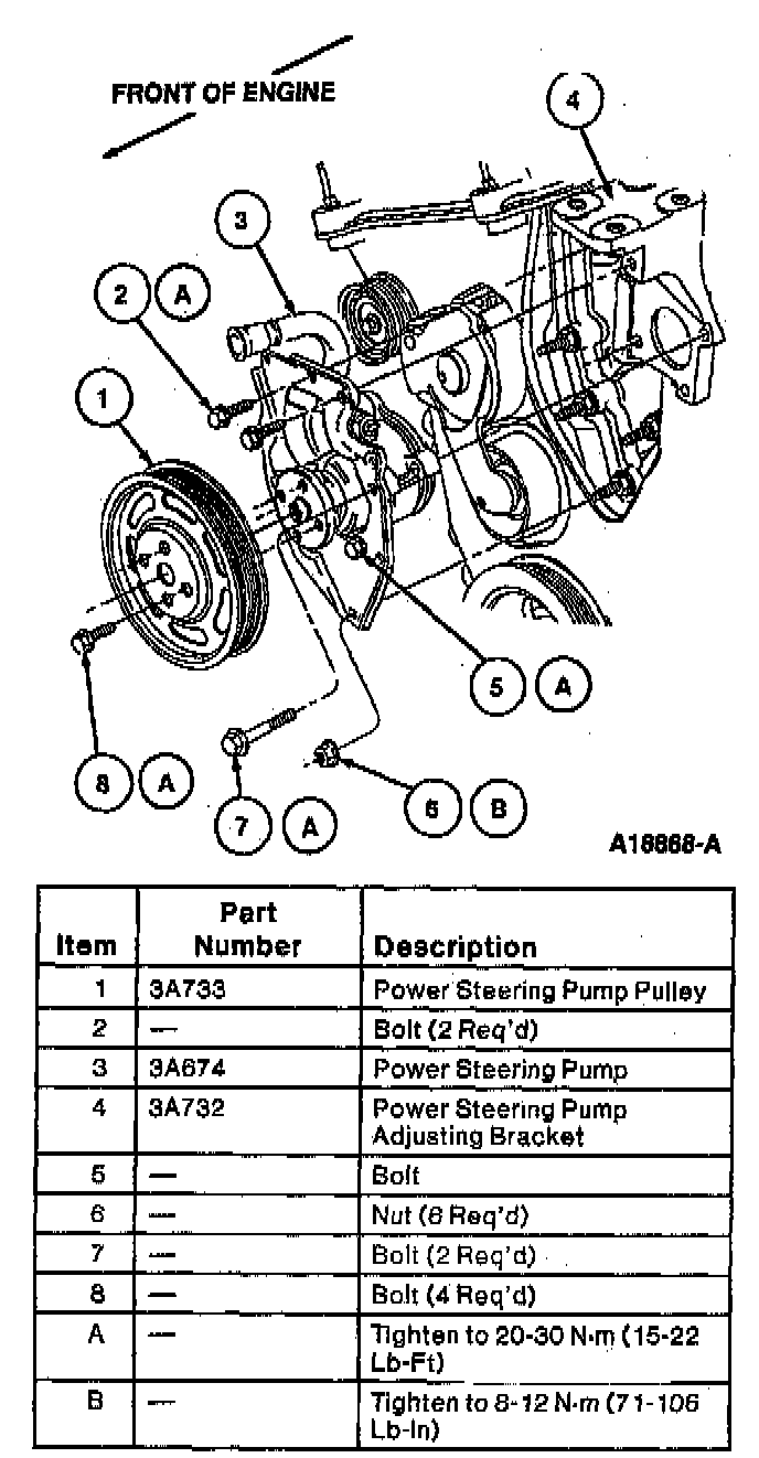 14. Remove power steering pump pulley (3A733) from power steering pump.