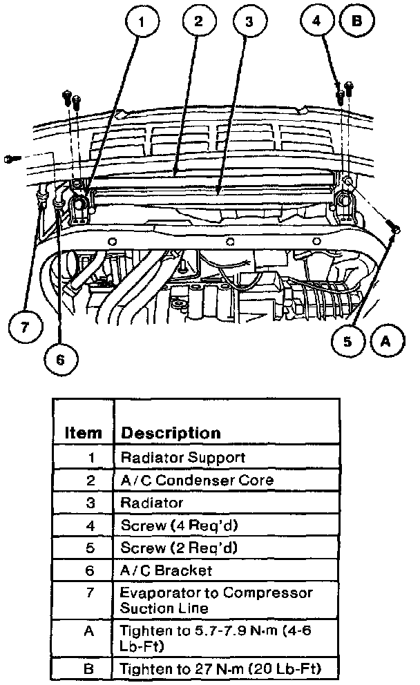 3. Install two screws to retain A/C condenser core to radiator. Tighten to 6-7 N.m (54-61 Lb-In).