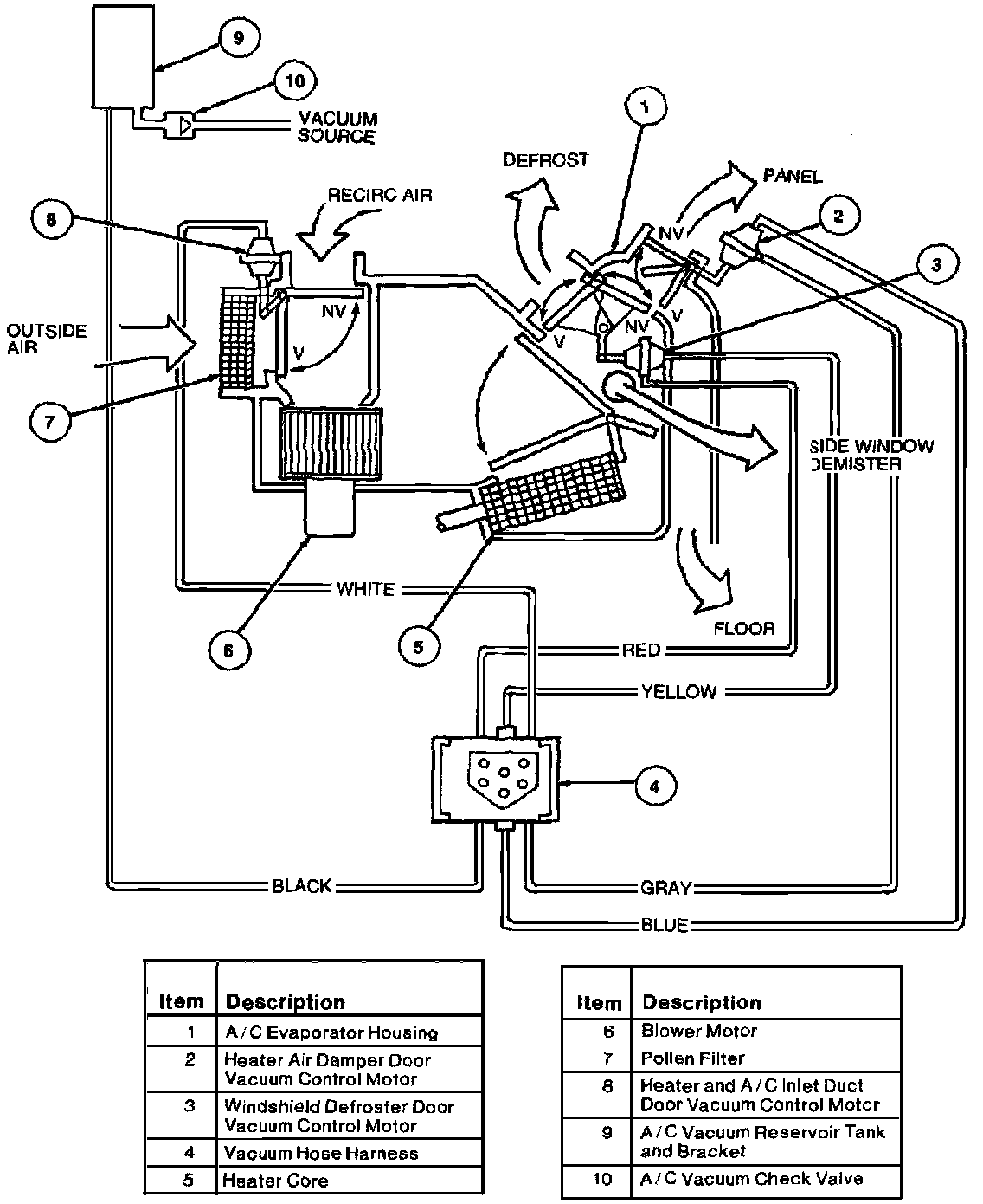 - the heater and A/C air inlet duct door, with no vacuum being applied, will block recirc. air and admit outside air. From there, airflow is directed through the system to the instrument panel A/C registers.