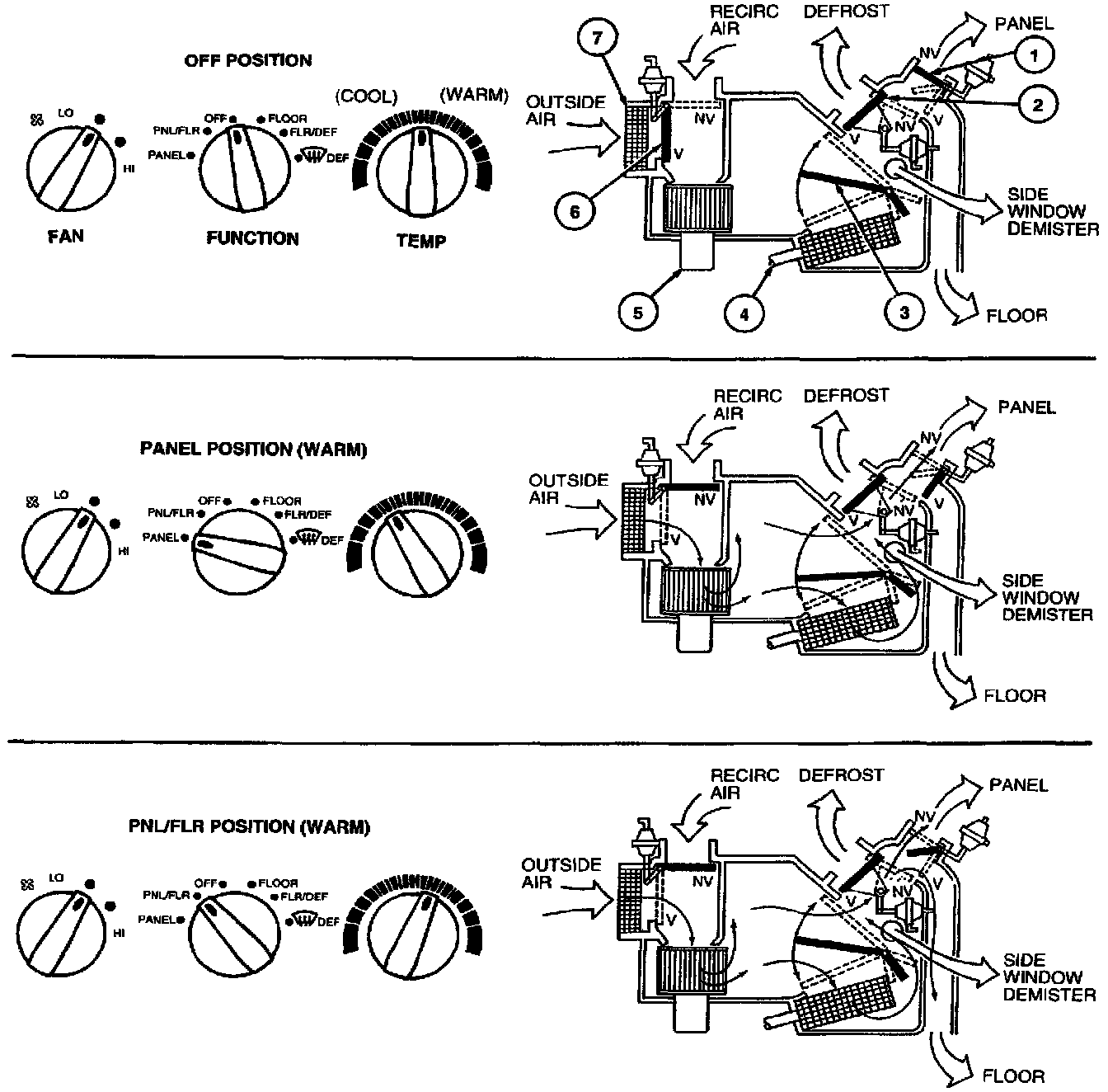 - the windshield defroster door is in the partial vacuum position allowing airflow to both heater outlet floor duct and windshield defroster nozzle.