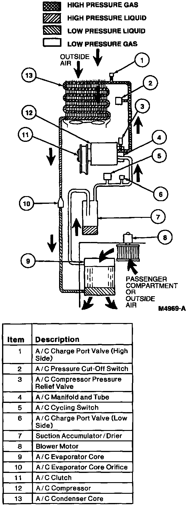 - High pressure liquid refrigerant from the bottom of the A/C condenser core enters the inlet side of the A/C evaporator core orifice.