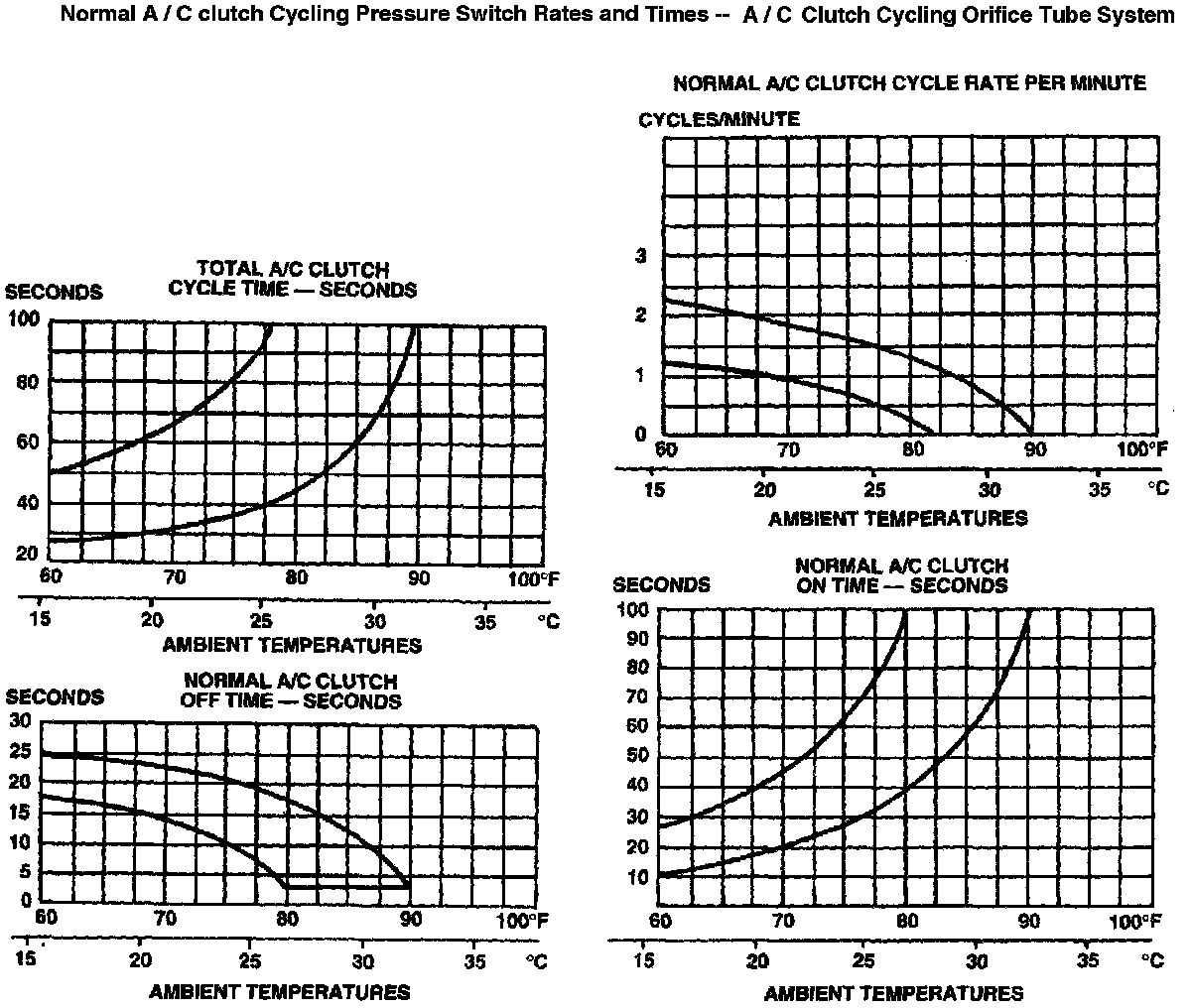 The best way to diagnose a condition in the refrigerant system is to note the system pressures (shown by the manifold gauges), and the A/C clutch cycle rate and times. Then compare the findings to the following charts.