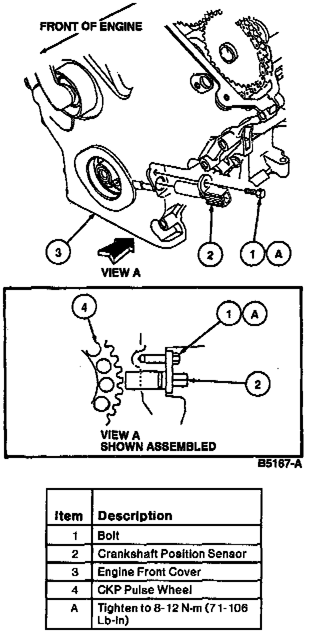 2. Position CKP sensor and install retaining bolt. Tighten retaining bolt to 8-12 Nm (71-106 lb-in).