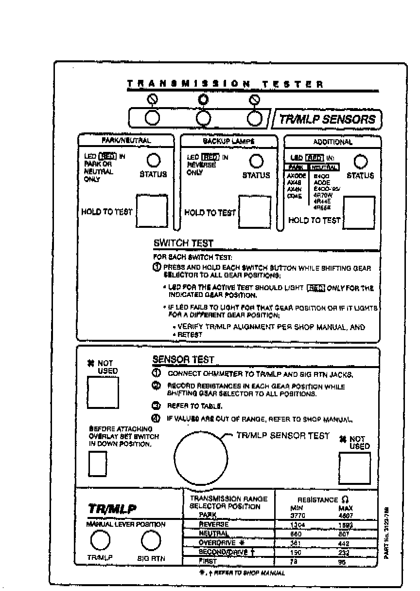 The transmission tester allows you to test the TR sensor independent of the vehicle electronics. TR sensor testing is divided into five steps: