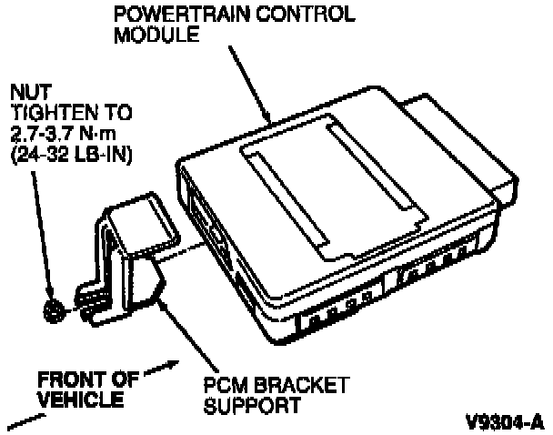7. To install, reverse removal procedure. Tighten PCM bracket support retainer nut to 4 Nm (35 lb in). Tighten engine control sensor wiring connector retainer bolt to 4 Nm (35 lb in).