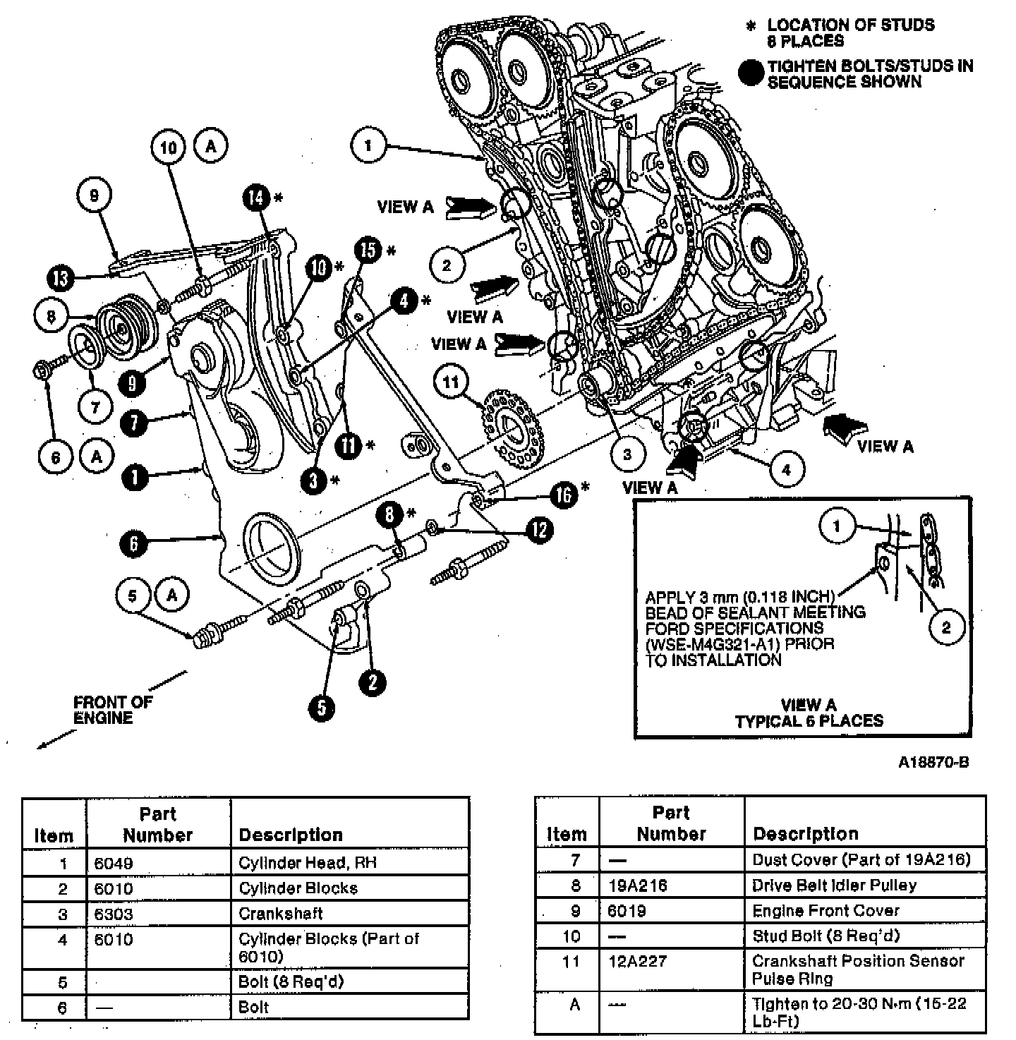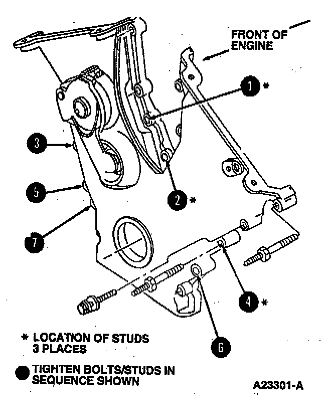 3. Tighten all engine front cover retaining bolts and stud bolts in sequence shown to 20-30 Nm (15-22 ft. lbs.).