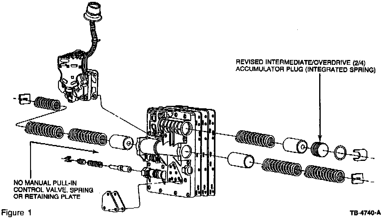 Beginning September, 1996 (Job # 1, 1997) the CD4E transaxle will contain a revised main control assembly. This revised design includes a new intermediate/overdrive accumulator valve plug and eliminates the pull-in control valve, spring and retaining plate (Figure 1).