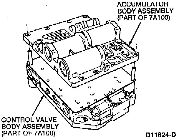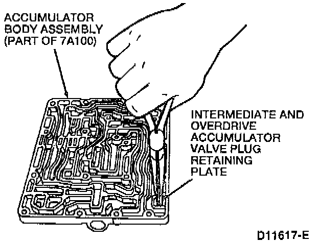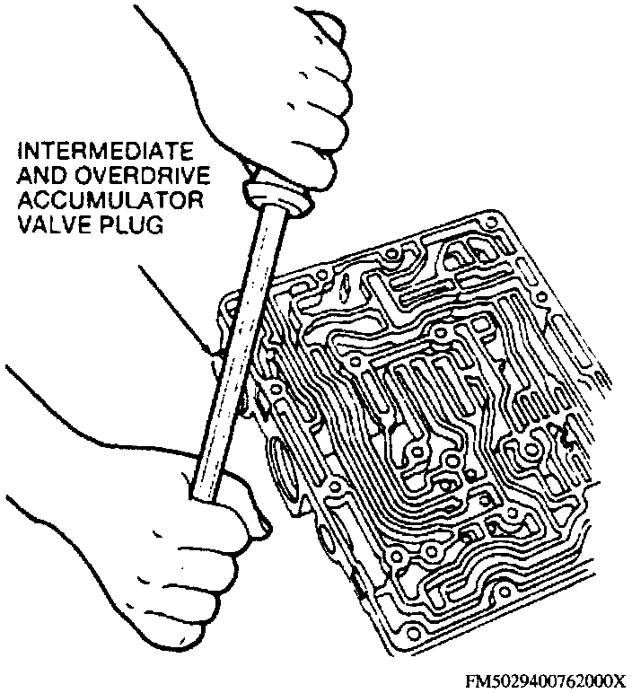 CAUTION: Prevent the intermediate and overdrive accumulator valve plug and seal from going too far into the bore and damaging the seal. Only push the low and intermediate accumulator valve plug until it is flush with accumulator body assembly.