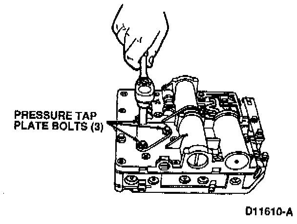 11. Install the pressure tap plate, gasket and three bolts on the accumulator body assembly. Tighten the pressure tap plate bolts to 7-9 Nm (62-79 inch lbs.)