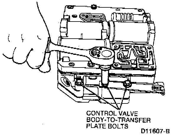 10. Install the three control valve body-to-transfer plate bolts and manual valve detent spring assembly. Tighten the control valve body-to-transfer plate bolts to 11-13 Nm (98-115 inch lbs.). Start with the middle bolt.