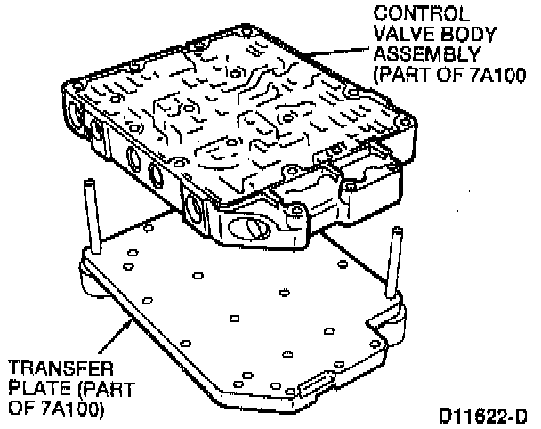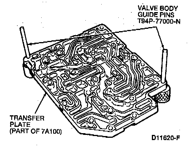 4. Install Valve Body Guide Pins T94P-77000-N in the transfer plate.