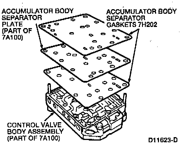 7. Install the accumulator body separator plate and gaskets on the control valve body assembly.