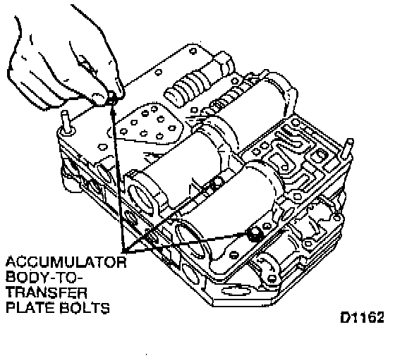 9. Install and tighten the three accumulator body-to-transfer plate bolts to 11-13 Nm (98-115 inch lbs.). Start with the middle bolt.