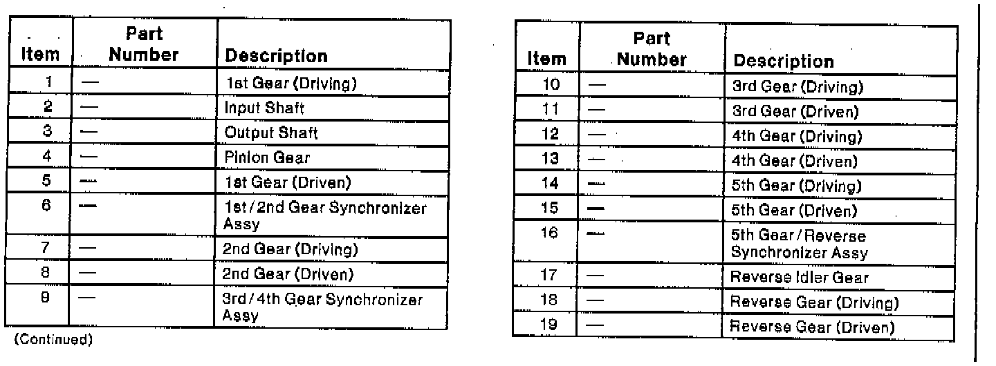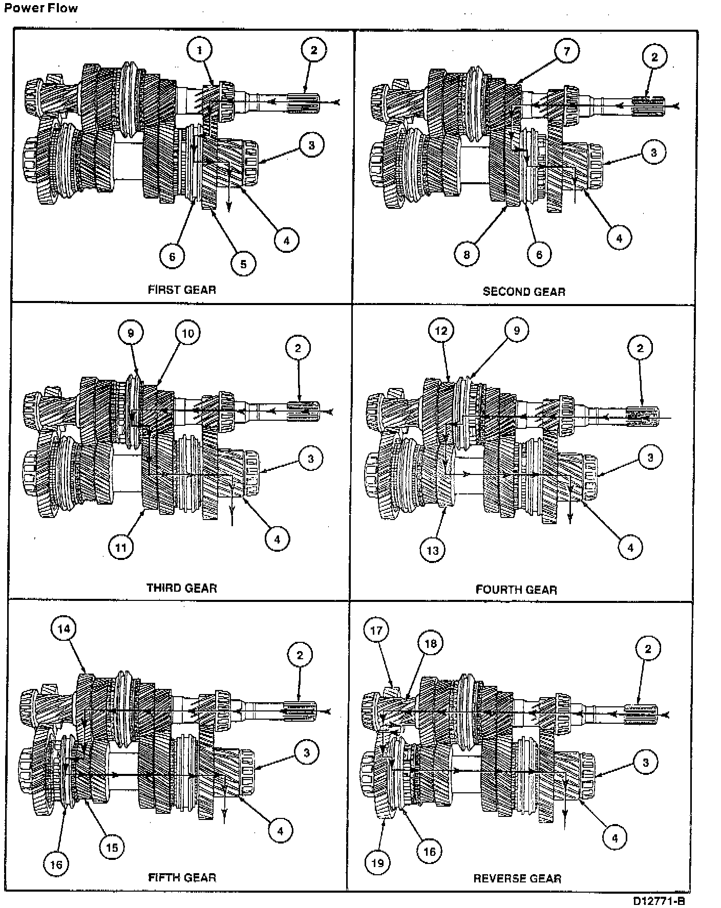 Engine torque is transmitted through clutch disc to transaxle input shaft. With a gear selected power is transmitted through input shaft to output shaft. The output shaft pinion gear drives the ring gear and differential. The reverse idler gear reverses direction of output shaft rotation.