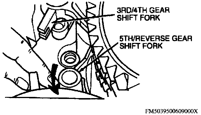 12. Swing the 5th/reverse gear shift fork to the side. Rotate and remove the 3rd/4th gear shift fork.
