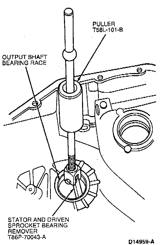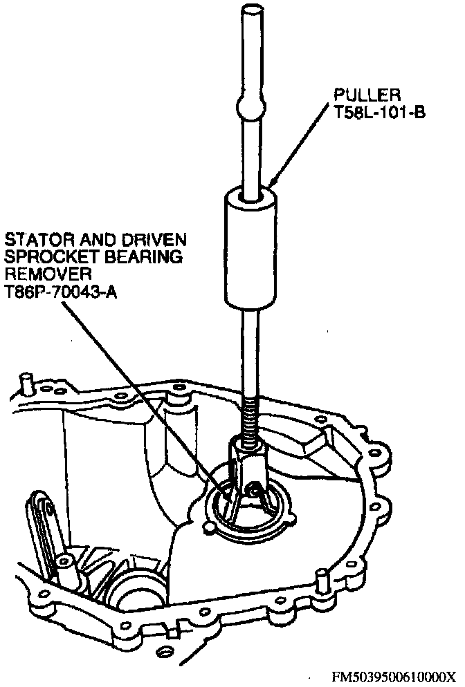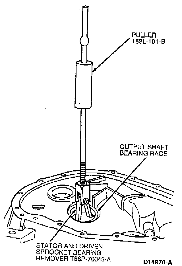 24. Remove output shaft bearing race from case using Puller T58L-101-B and Stator and Driven Sprocket Bearing Remover T86P-70043-A.