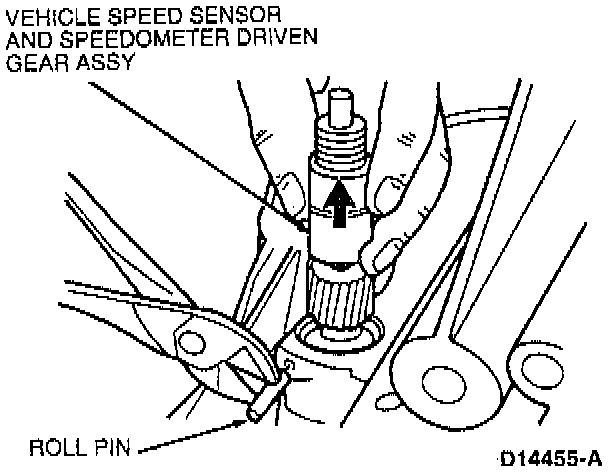 5. Remove roll pin retaining the speedometer driven gear assembly and remove the assembly.