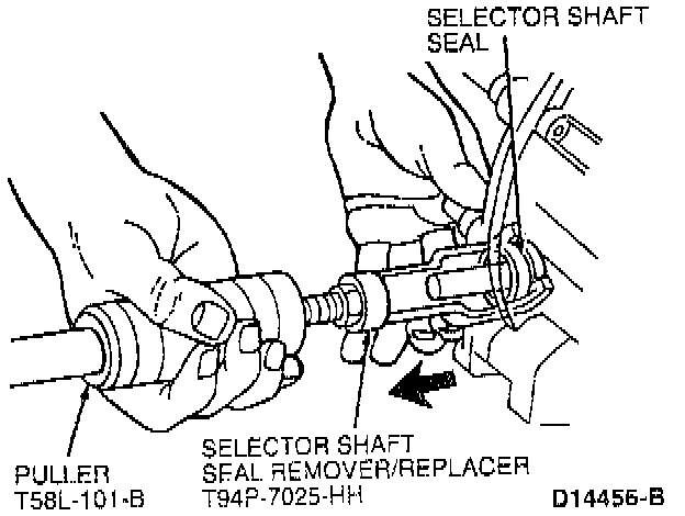 6. Remove shifter shaft seal using Selector Shaft Seal Remover/Replacer T94P-7025-HH.