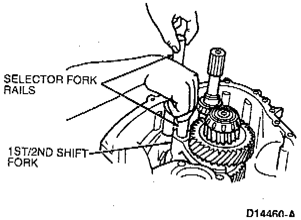 11. Pull the long and short selector fork rails from the case. Remove the 1st/2nd gear shift fork.