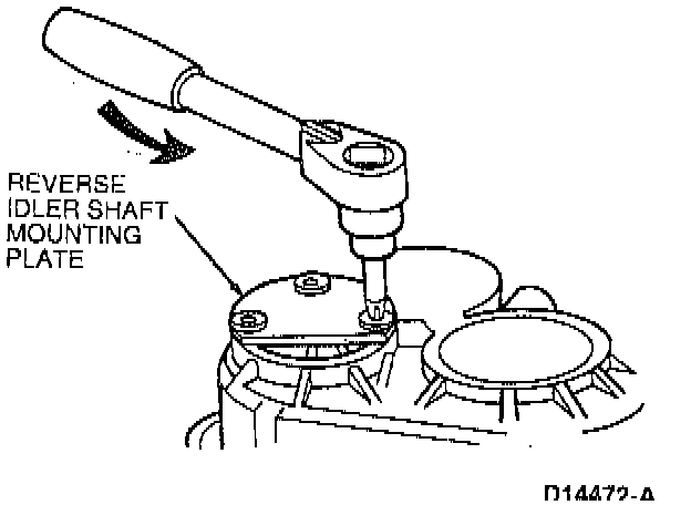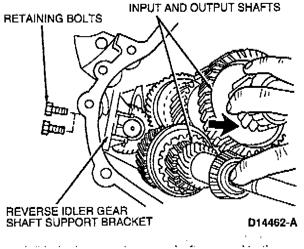 13. Remove two reverse idler gear shaft mounting bracket retaining bolts. Swing input and output shafts to the side. Remove reverse idler gear shaft mounting bracket.
