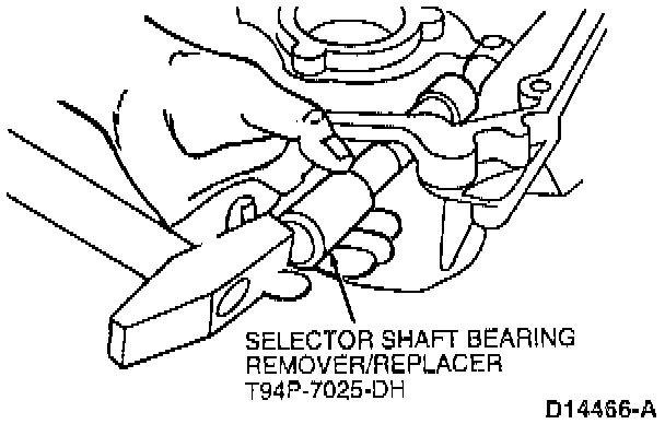 17. Remove outer shift lever shaft bushing using Selector Shaft Bearing Remover/Replacer T94P-7025-DH.