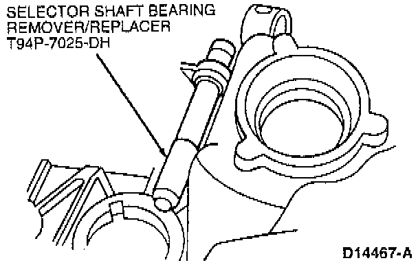 18. Remove inner shift lever shaft bearing assembly using Selector Shaft Bearing Remover/Replacer T94P-7025-DH.
