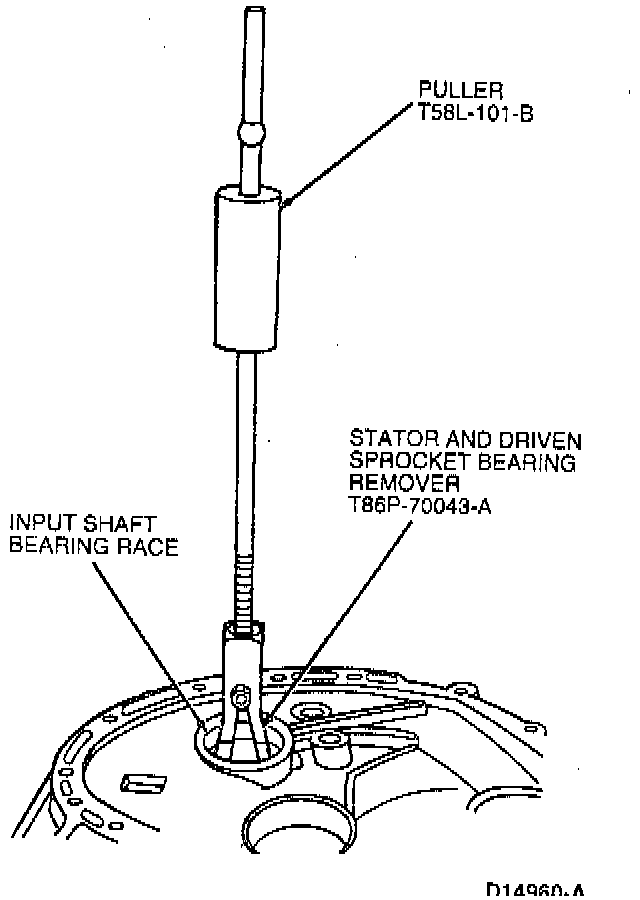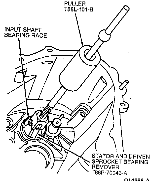 23. Remove input shaft bearing race from case using Puller T58L-101-B and Stator and Driven Sprocket Bearing Remover T86P-70043-A.