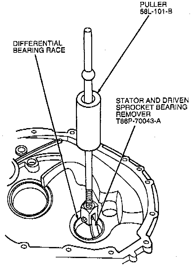 19. Use Puller T58L-101-B and Stator and Driven Sprocket Bearing Remover T86P-70043-A to remove differential bearing race from case