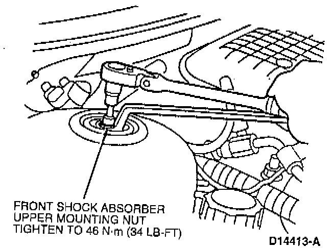35. Remove front shock absorber upper mounting nuts. Replace with new locknuts and tighten to 46 Nm (34 ft. lbs.).