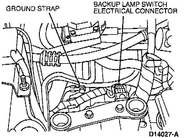 12. Install ground strap to transaxle retaining bolt. Connect backup lamp switch connector.