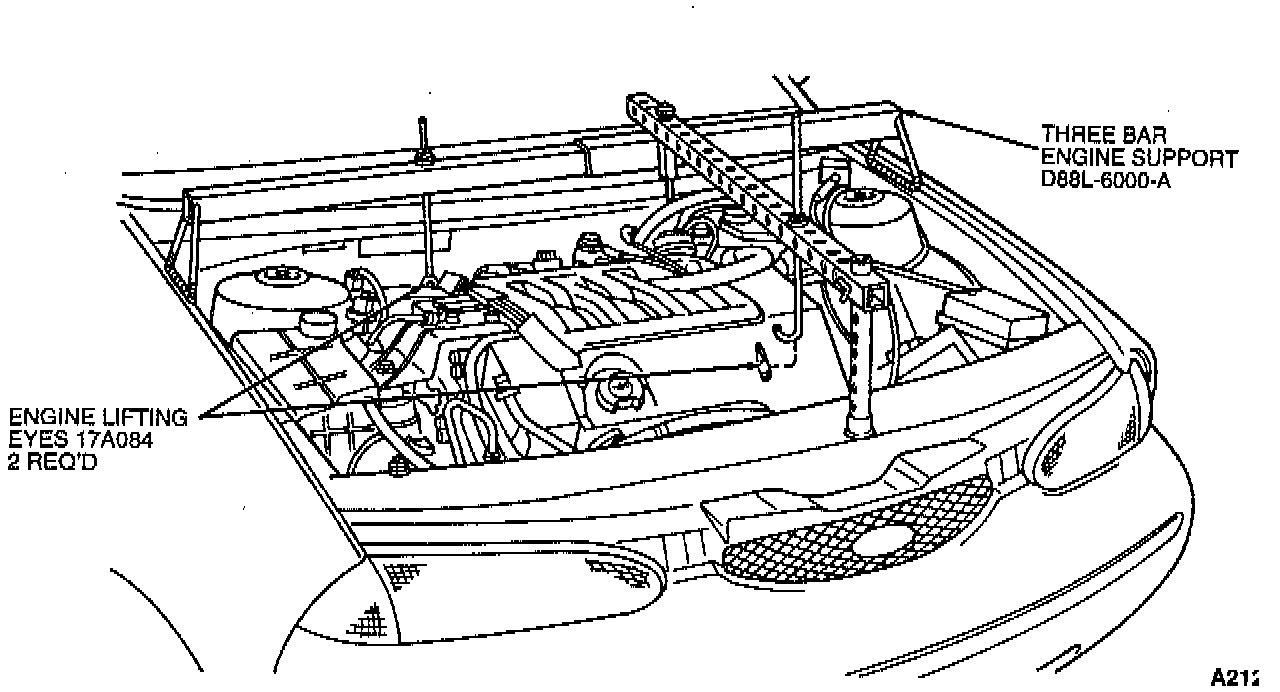 31. Remove Three-Bar Engine Support D88L-6000-A or equivalent.