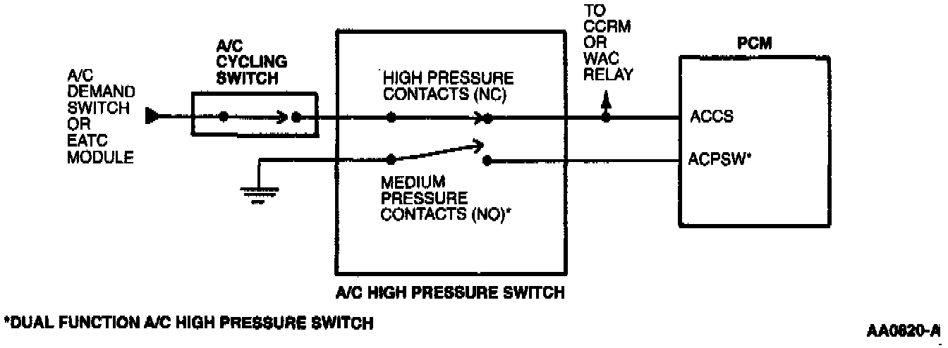 The Air Conditioning Cycling Switch (ACCS) provides a voltage signal input to the Powertrain Control Module (PCM) which indicates when the A/C is requested. When the A/C demand switch is turned ON, and both the A/C Cycling Switch and the high pressure contacts of the A/C Pressure Switch are closed, voltage is supplied to the ACCS circuit signal at the PCM.