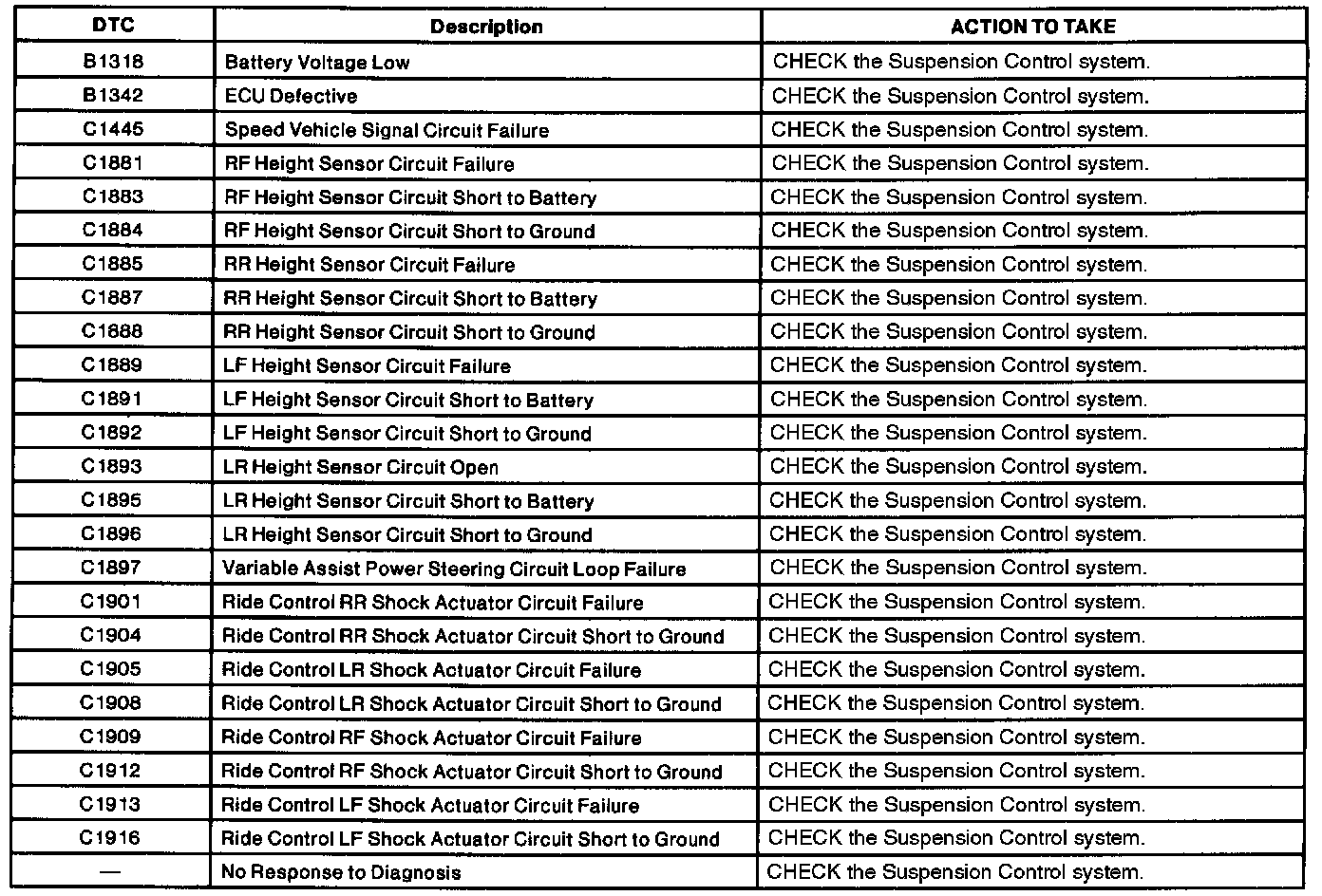 Semi-Active Ride Control Module Diagnostic Trouble Code Index