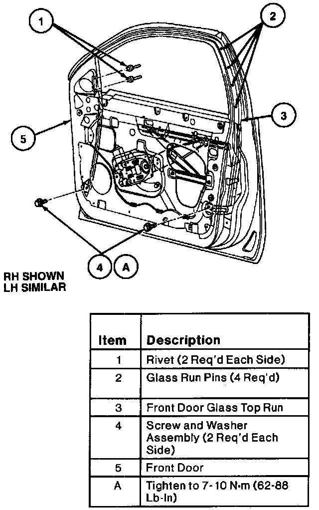 8. Install front door glass top run to door inner panel with two screws. Tighten to 7-10 Nm (62-88 Lb-In).