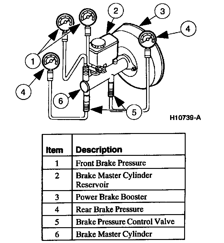 4. Press the brake pedal until the front brake pressure is 5,884 kPa (850 psi). The rear brake pressure should be 2,476 kPa ±196 kPa (398 psi ±28 psi). If not as specified, replace the brake pressure differential valve in question.