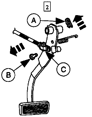 - Remove the (A) cotter pin and (B) clevis pin from the (C) brake master cylinder pushrod fork end bracket.