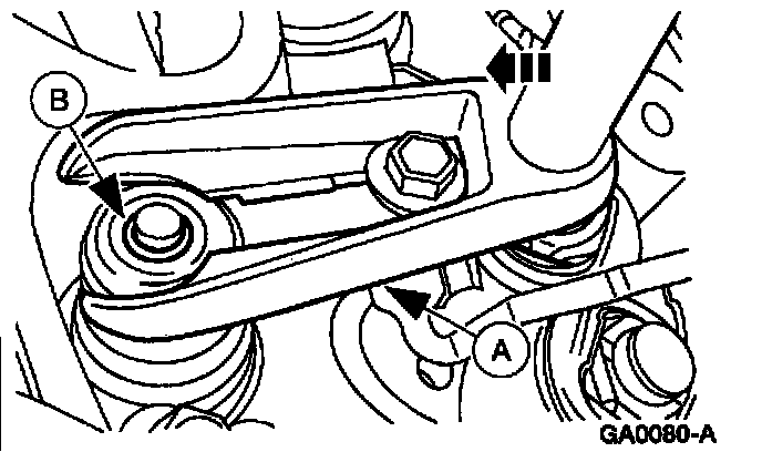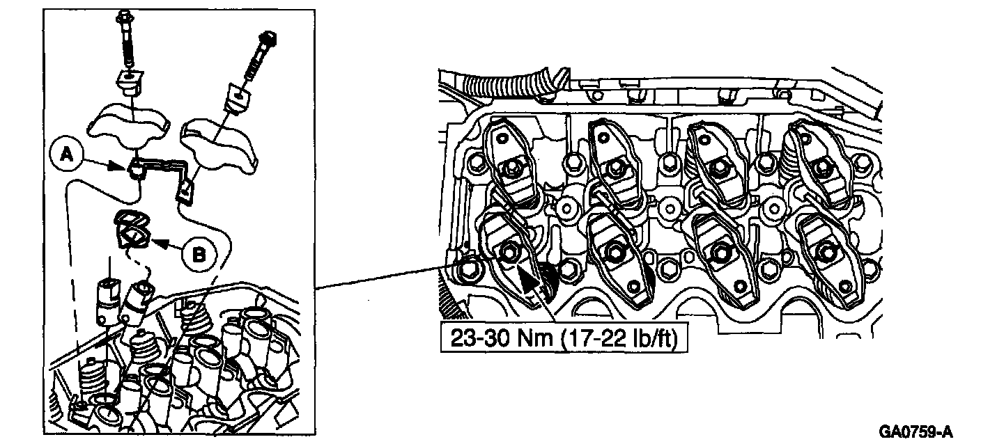 ^ Be certain the (A) valve tappet guide plate retainer tabs are toward the rear of the cylinder head, and the (B) valve tappet guide plate tabs are toward the front of the cylinder head.