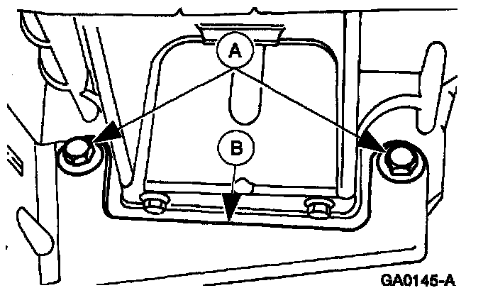 3. Remove the (A) two oil pan to transaxle bolts and remove the (B) TWC to oil pan bracket.