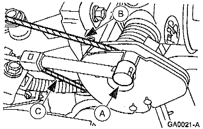 4. Disconnect the (A) speed control cable (if equipped), the (B) accelerator cable (9A758), and the (C) throttle valve control actuating cable (7F042) (AT only) from the throttle control lever (9A776).