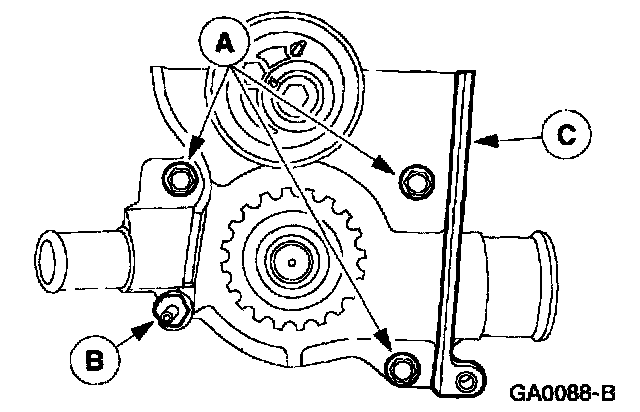 7. Remove the (A) three bolts and (B) one stud and remove the (C) water pump.