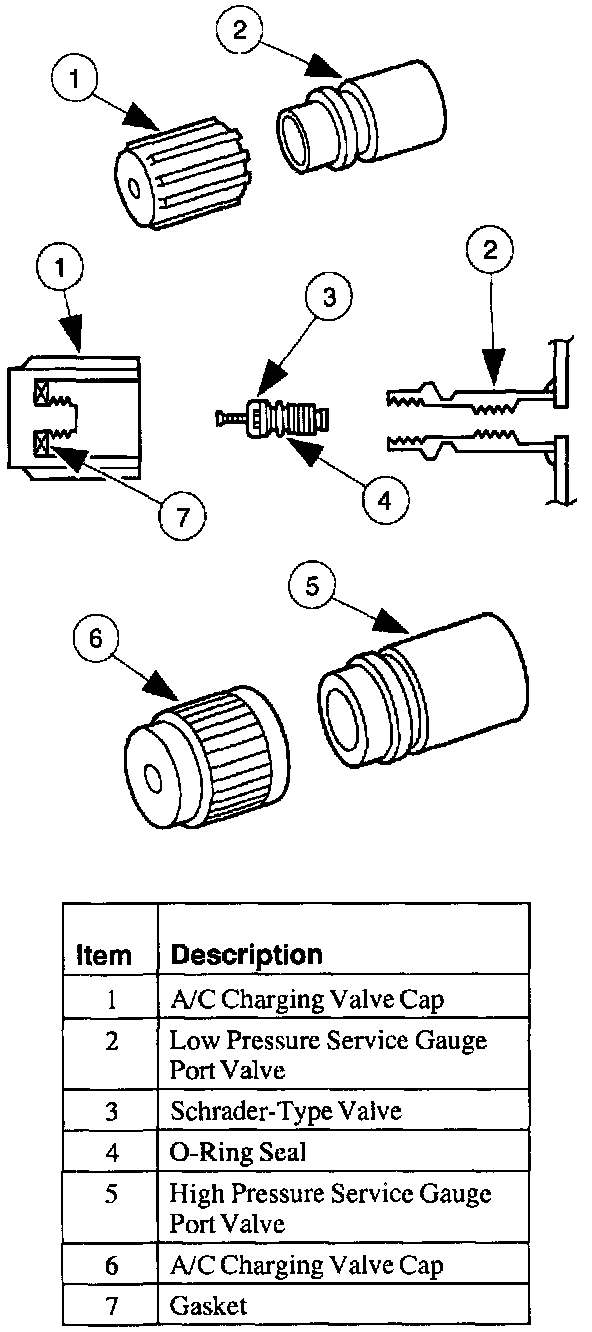 ^ Always install the A/C charging valve cap on the service gauge port valves after repairing the refrigerant system.