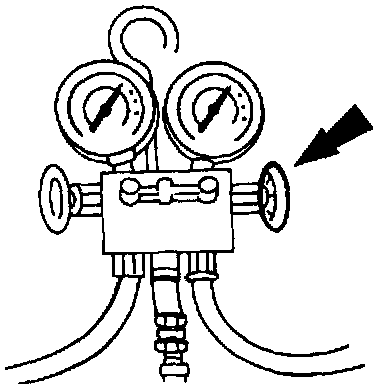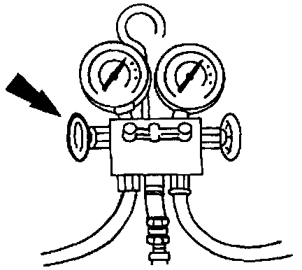 5. Open the high-pressure valve on the manifold gauge set to allow the refrigerant to enter the system. Continue to add refrigerant until the proper amount is drawn into the system. Consult the vehicle specification label. Then close the high-pressure valve.