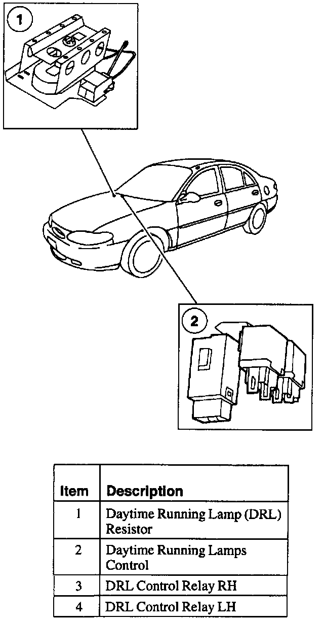 Models sold in Canada incorporate a Daytime Running Lamp (DRL) system. The daytime running lamps control operates the high-beam headlamps, at a reduced voltage, when the ignition switch is in the ON position, the parking brake is disengaged, and the headlamp switch is OFF. Although the DRL system uses the high-beam filament of the headlamp, it has a voltage reducing resistor to dim the headlamps for daytime operation. This allows the flash-to-pass function during DRL system operation.